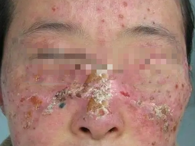牛痘样水疱病非典型重型患者脸上会出现大面积红斑,在红斑的基础上可见点状或不规则形较厚的黄白色痂皮,患者多自觉疼痛。