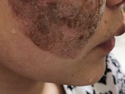 牛痘样水疱病非典型重型患者脸上见大片较厚的黑色痂皮,表面凹凸不平,干燥、粗糙,伴有暗红色色素沉着斑,边缘欠清晰。