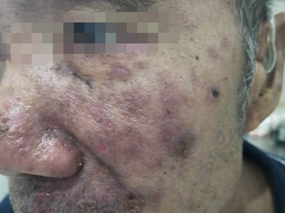 牛痘样水疱病非典型重型脸上暗红色斑块图