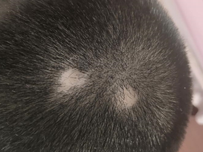 脱发性毛周角化病累及头皮,表现为头顶上有两处头发几乎完全脱落,露出头皮,脱落区面积较小,直径约1cm,形状不规则,皮肤颜色正常,上有稀疏毛发分布。