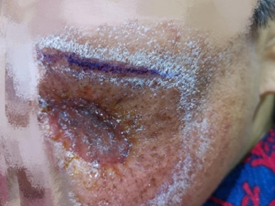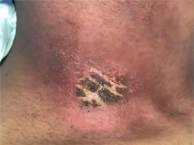 Ⅲ度急性放射性皮炎出现于颈部,局部红肿严重,并有大片色素沉着而发黑,皮损中央存在一褐色的溃疡结痂面,表面开裂,流黄色的脓性物质,伴明显疼痛。