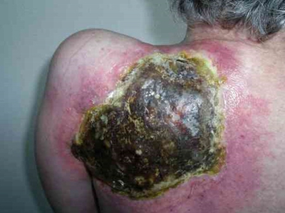 Ⅲ度急性放射性皮炎后背一大块黑色痂皮图