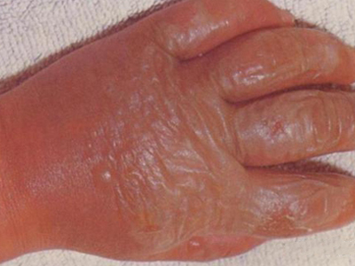 Ⅲ度急性放射性皮炎患者的病情较为严重,造成整个手部呈现暗红色的肿胀,并有灼热感和疼痛感,其上附着有一层薄皮,可出现破裂。