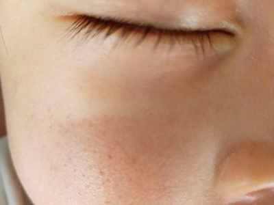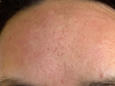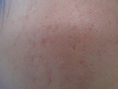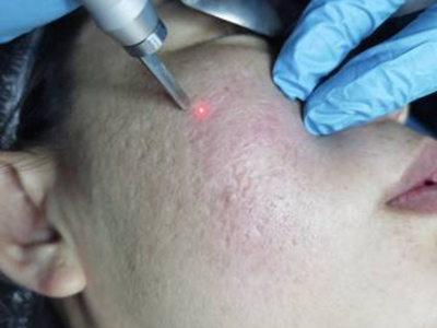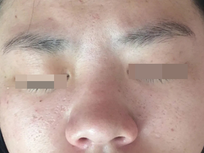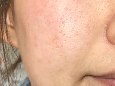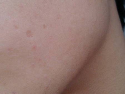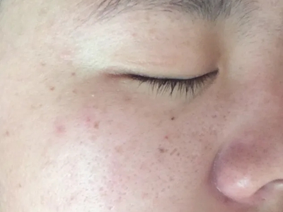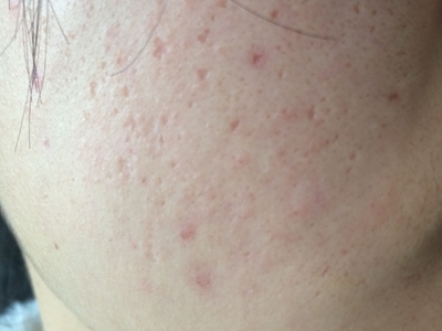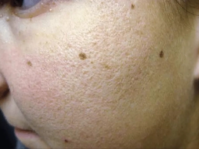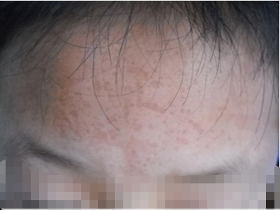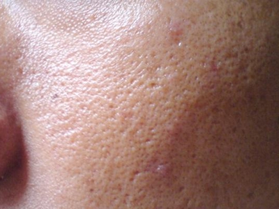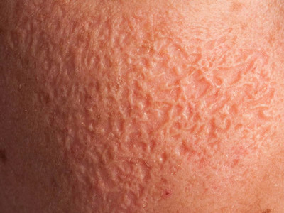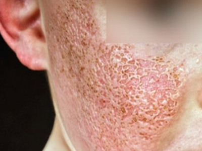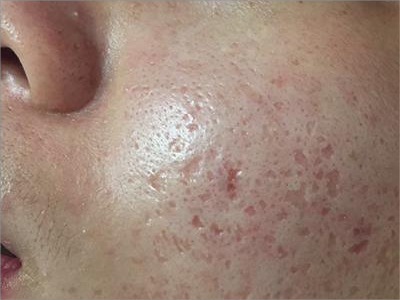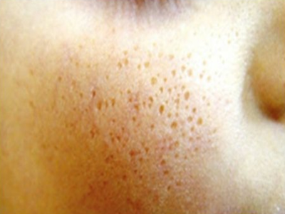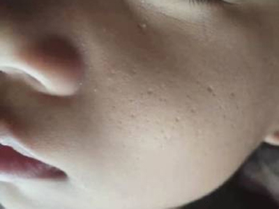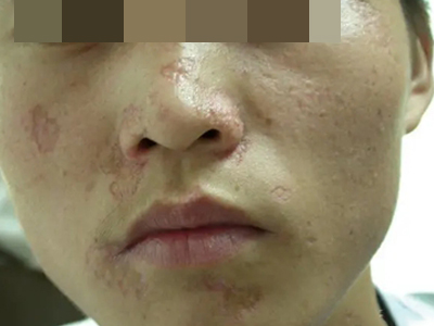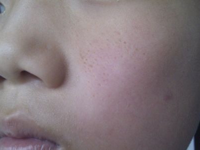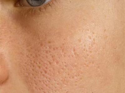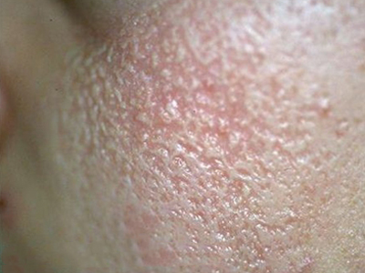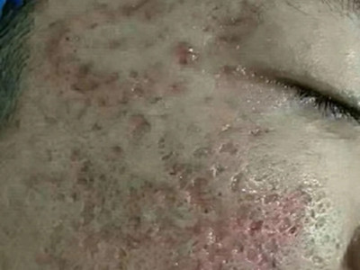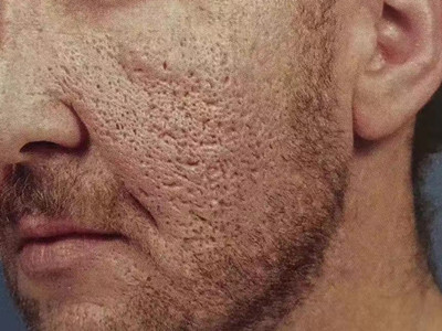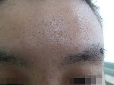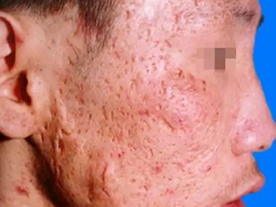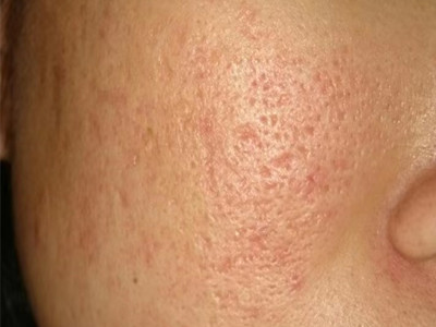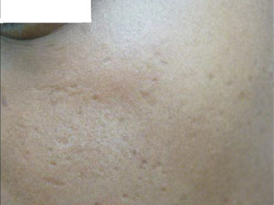 2、虫蚀状皮肤萎缩:女性稍多,一般5-12岁发病,好发于双侧颊部、耳前区,可扩展至额、颏和耳前。表现为红斑和毛囊角质栓,典型损害为无数密集的虫蚀状萎缩性小凹,直径约2mm,深约1mm,形状不规则,对称分布,呈蜂窝状。萎缩处皮肤稍硬,蜡样光泽,正常处皮肤可见黑头和粟丘疹。