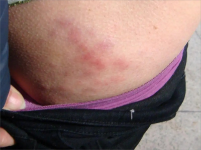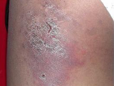 寒冷性脂膜炎患者臀部出现边界不清晰的红色结节、斑块,伴随有肿胀,中间皮损较严重,呈现为暗红色,结节可相互融合,也可单独存在,随疾病进展,严重时会伴随有水疱或破溃。