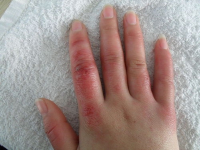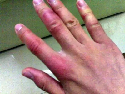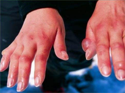 寒冷性脂膜炎患者手部受冻后,手指皮肤呈紫红色结节性隆起,肿胀明显,界限不清楚,局部皮肤的温度降低,同时伴有轻度的疼痛感。