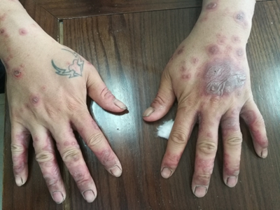 寒冷性脂膜炎手背有紫红色斑块溃烂图
