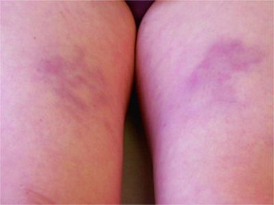 寒冷性脂膜炎患者多表现为遇冷后,大腿皮肤出现对称的暗紫红色斑块,质地略硬,形态不规则,边界欠清,皮温低,偶有针刺样疼痛。