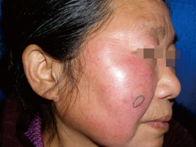 寒冷性脂膜炎皮损可见成年女性的面颊部,表现为肿胀性红斑,同时还可触及深部皮下结节,质地较硬,边界欠清,表面呈淡红色,未见萎缩及瘢痕。