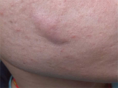 寒冷性脂膜炎患者在脸颊部位出现硬块,蚕豆大小,表面皮肤也发生改变,表现为淡淡的红色,但皮肤表面完整,没有发生破溃,用手触摸质地较硬。