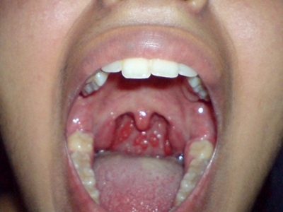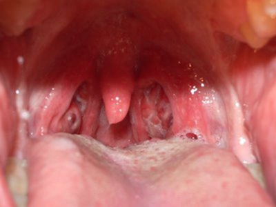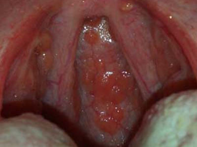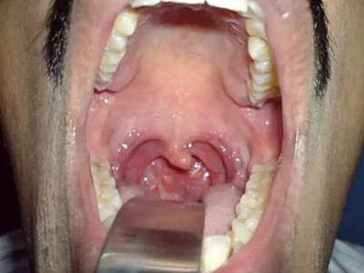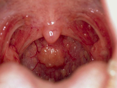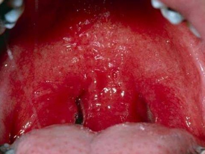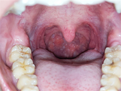 慢性咽炎患者可出现咽部异物感、痒感、干燥感等。常有黏稠分泌物附着于咽后壁,使患者晨起时出现咳嗽伴恶心。慢性单纯性咽炎检查可见黏膜充血,血管扩张,咽后壁有散在淋巴滤泡,常有少量黏稠分泌物附着在黏膜表面。