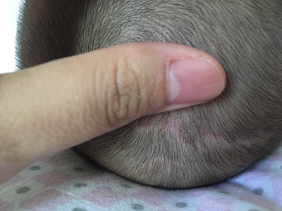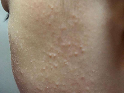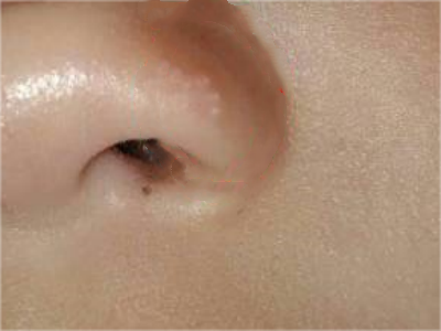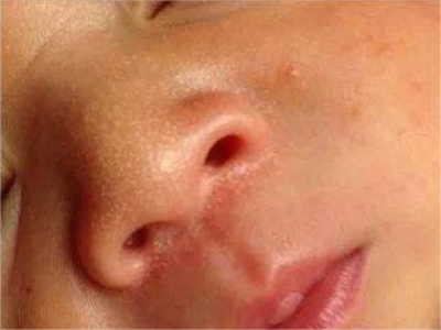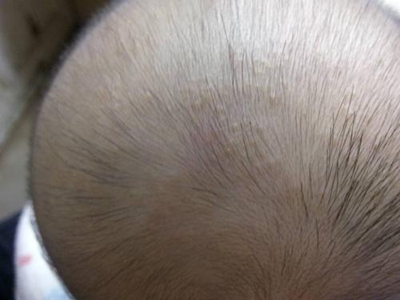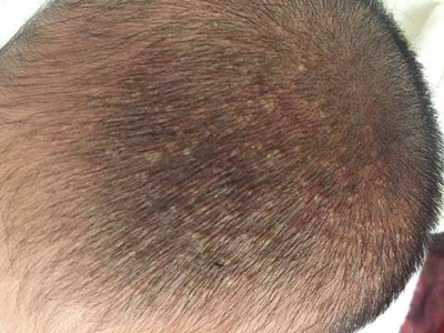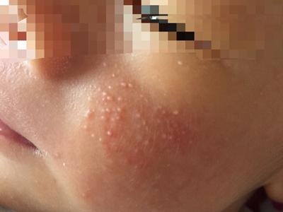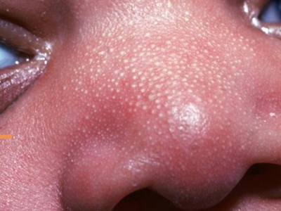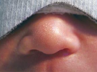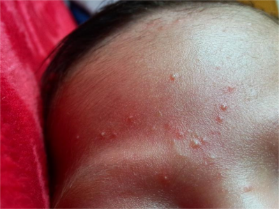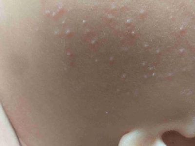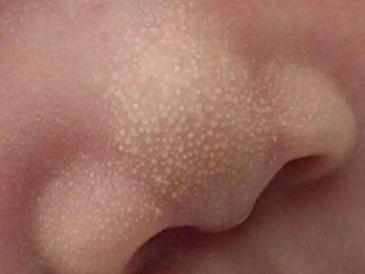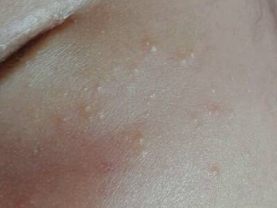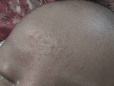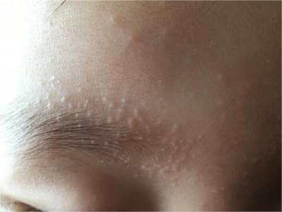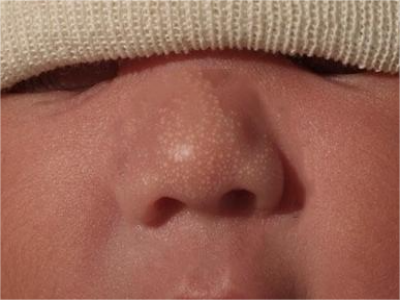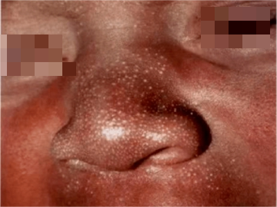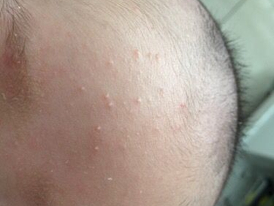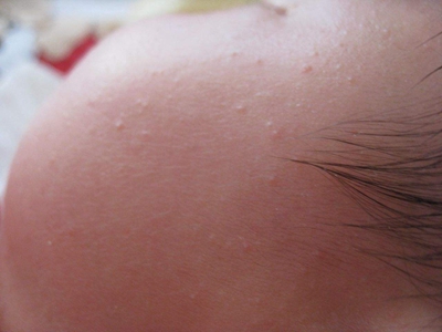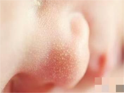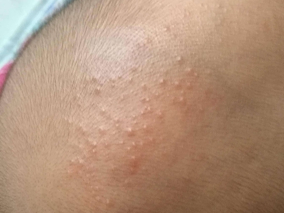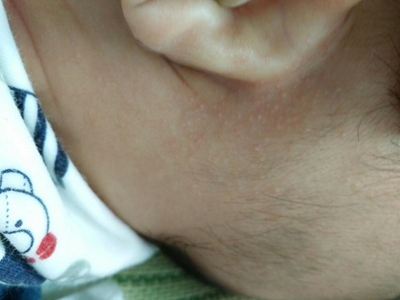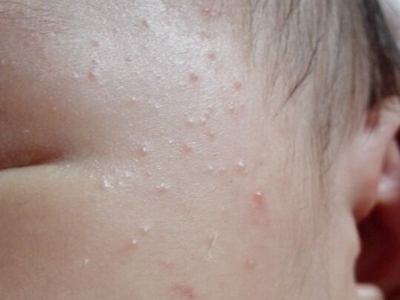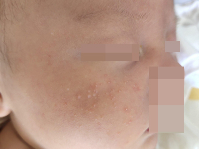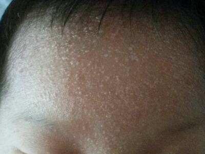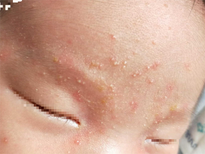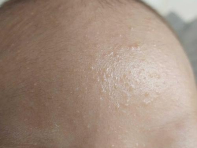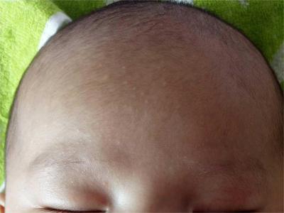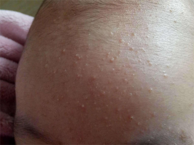 新生儿皮脂腺增生发生于患儿的额头及眉间,皮损为密集分布的小丘疹,大小不一,形态呈圆形或不规则形,顶部高耸或扁平,均突出于皮肤表面,边界清晰,周围皮肤正常。
