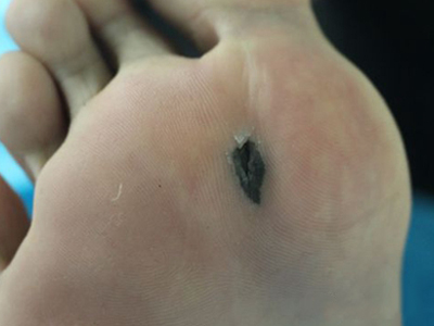恶性雀斑样痣发生在脚后跟,表现为黑色的斑块,表面粗糙,伴有溃烂,并有结节、脱皮等症状,为了防止溃烂加重,应遵医嘱尽早采取手术切除治疗。