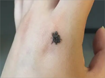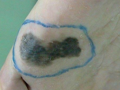 恶性雀斑样痣的患者脚底出现一小片黑斑,略微高于皮面,形状不规则,生长缓慢,但会逐渐扩大面积。由于皮损位于脚底,容易受到挤压、摩擦,为防止病情加重,建议尽早进行手术治疗。