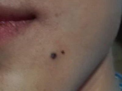 恶性雀斑样痣的患者,在下巴的部位长出一块圆形黑痣,略微突出于皮肤表面,随着病情的进展,黑痣会不规则地向周围扩大,并且颜色会逐渐加深。
