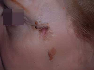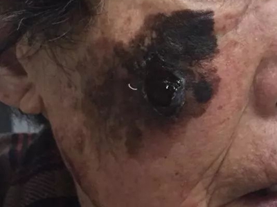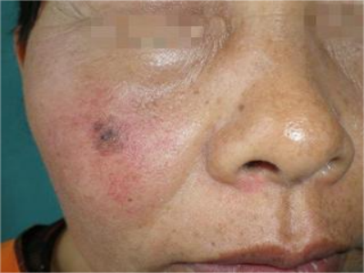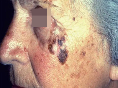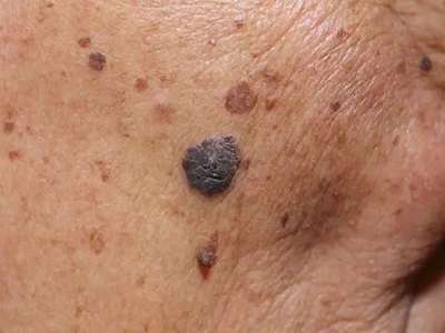 恶性雀斑样痣的患者,在眼角部位出现棕褐色的斑片,以及突出于皮肤表面的黑疙瘩。斑片部位的皮损出现溃烂,会伴有疼痛症状,需要尽快采取手术切除治疗。
