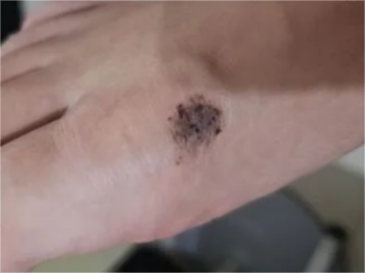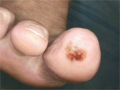恶性雀斑样痣患者大脚趾头上出现一个褐色斑块,颜色分布不均匀,形状不规则,边缘呈不规则状向外扩大,病程进展相对缓慢,应及时手术切除治疗。