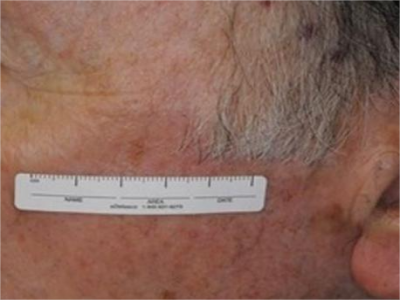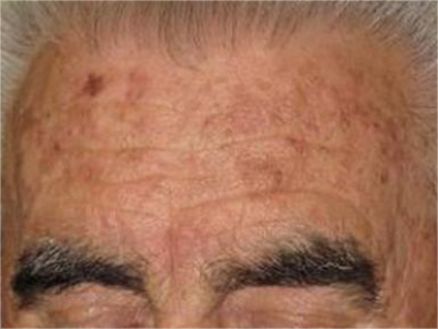 恶性雀斑样痣长在患者的前额部,表现为形状不规则的黑痣,颜色不均匀,中间呈黑色且稍微隆起,外缘为与皮面平齐的浅褐色,边界清楚,随着病情进展会逐渐扩大。