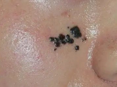 恶性雀斑样痣的患者在面部鼻翼右侧区域,出现数颗黑痣,互相能够融合,形状不规则,突出于皮肤表面,质地坚韧,随着病情的进展,皮损会逐渐扩大。