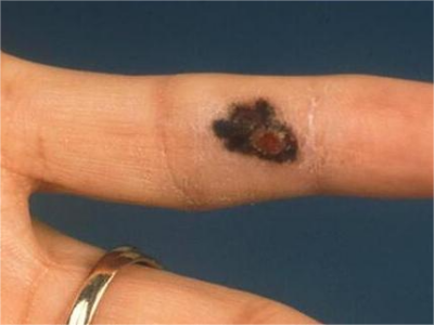 恶性雀斑样痣的患者,在手指上发作时,皮损呈黑色的斑片,形状不规则,病情严重的患者,黑斑上会出现溃烂、结痂等症状,伴有明显的疼痛等症状。