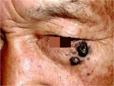 恶性雀斑样痣的患者,皮损在左眼眼角下皮肤上长出两颗黑色块状物,突出于皮肤表面,呈肉疙瘩状,质地坚韧,周围分布有细小的黑色斑片。