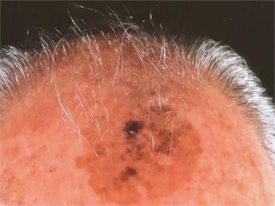 恶性雀斑样痣会累及患者头皮,导致头皮上出现两片淡褐色的斑痣,大小不一,形状不规则,边界不清楚,表面毛囊未受损还能看到细小的头发。