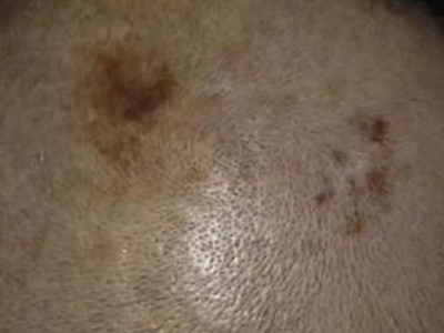 恶性雀斑样痣发生在患者头皮上,表现为数片大小不等的黑色斑片,相邻的小斑片能互相融合成较大的斑片,形状各异,黑斑周围的皮肤呈黄褐色。