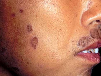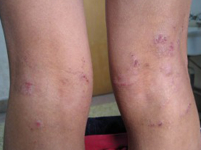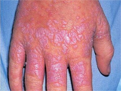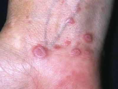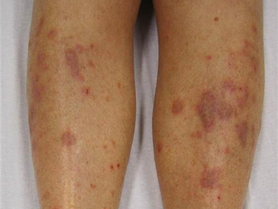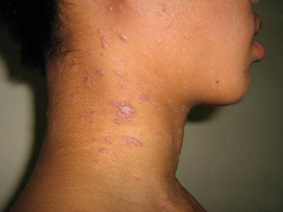 光滑性扁平苔藓的皮损发生在日光暴晒的部位,如前额,表现为淡红色的扁平丘疹,呈群集分布,有典型的苔藓样改变,呈网状,皮损中央伴有萎缩。