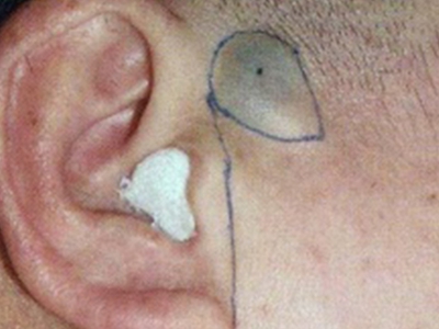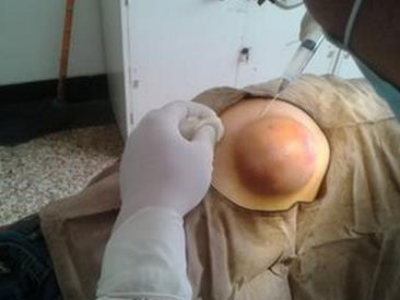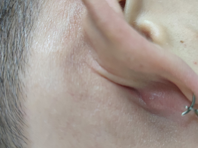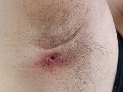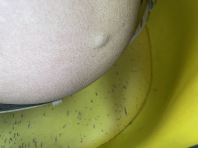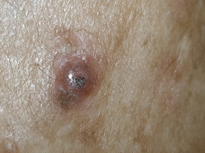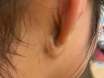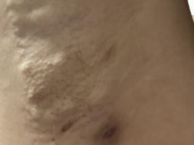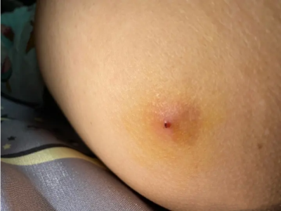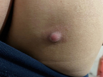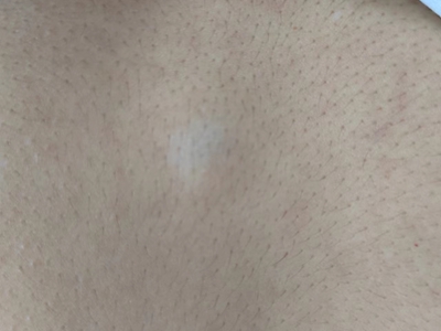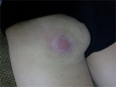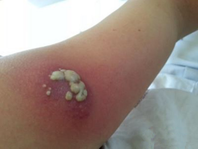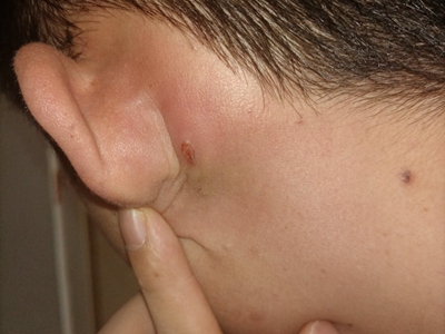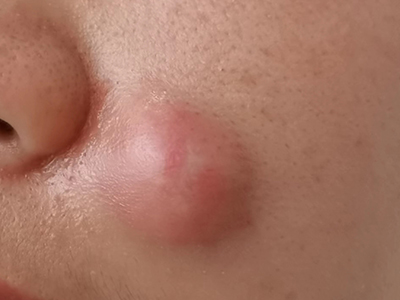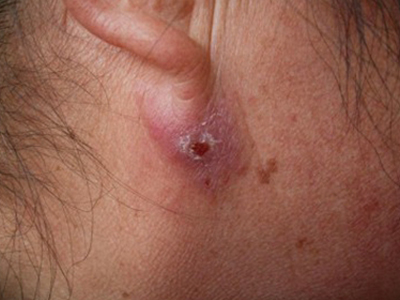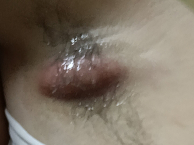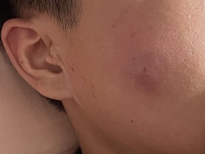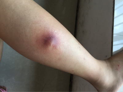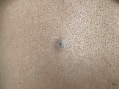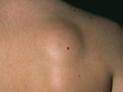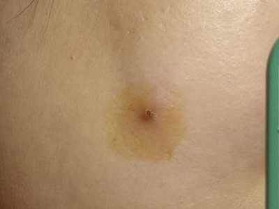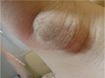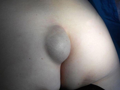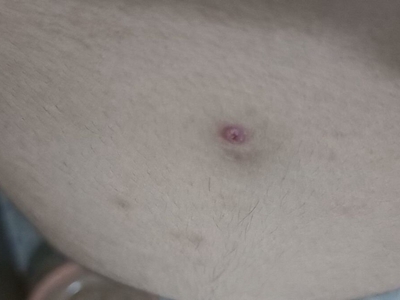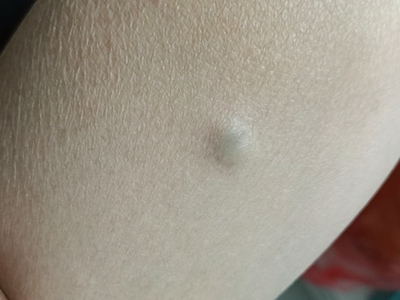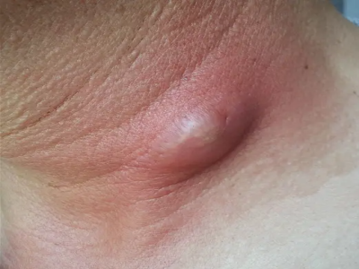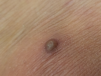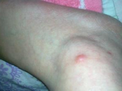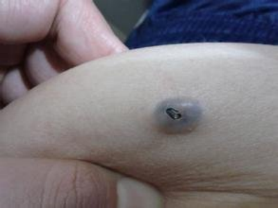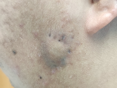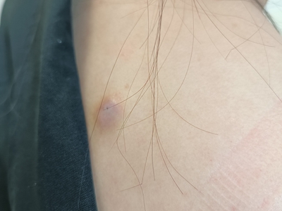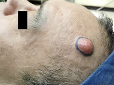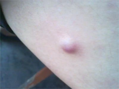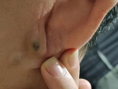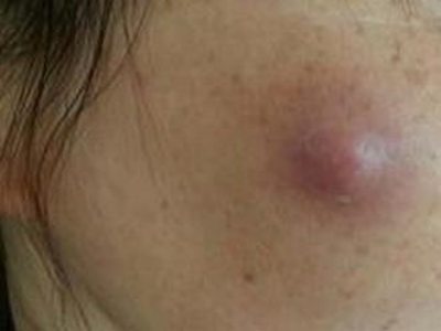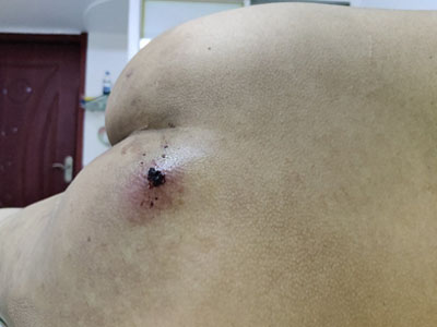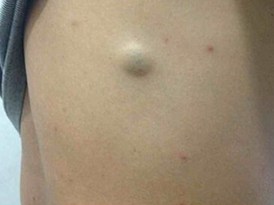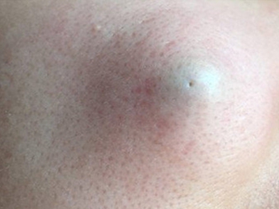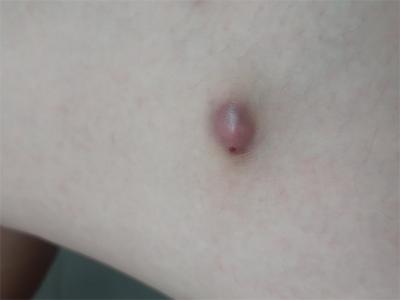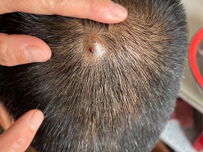 皮脂腺囊肿患者头皮出现一个疙瘩,表面颜色无改变,形状如一元硬币大小,上面有一小破损出现少量流血,并发生凝固,伴有头发脱落。
