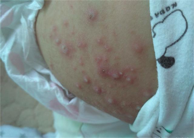 手足口病侵犯臀部时,表现为独立存在的小丘疹,呈圆形或椭圆形的凸起,看似小红疙瘩,可聚集成片出现,部分疙瘩顶部出现轻微结痂的表现,暗示着疾病正在恢复。此时避免搔抓,以免造成疙瘩破溃或结痂脱落。
