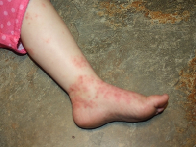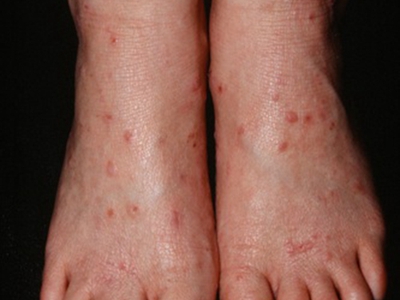 手足口病好发于脚部,表现为脚背上出现很多绿豆大小的红色疙瘩,稍高于正常皮肤,周围有少量红晕,部分皮损因搔抓而出现点状结痂。