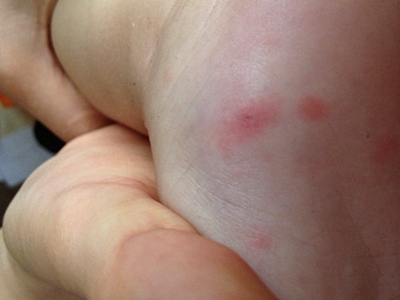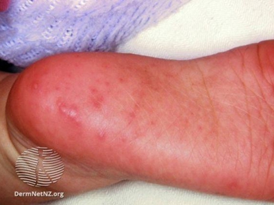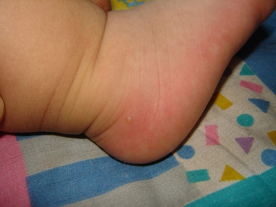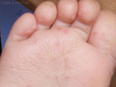 手足口病初期为米粒至绿豆大小的红色疙瘩,随后可在疙瘩的基础上出现水疱,直径约7mm,疱壁开始时较厚,周围有红晕,主要集中于患者的脚后跟处。