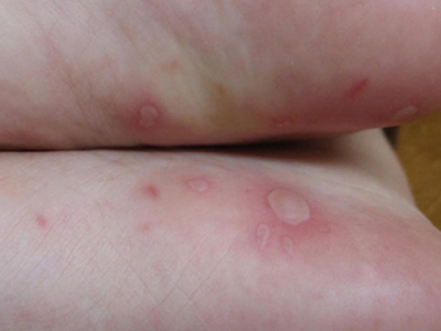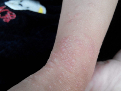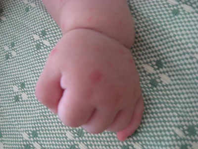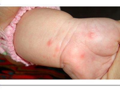 手足口病患者出现水疱前的皮损为小红疙瘩,散在分布于患者手腕处,边界不清晰,疙瘩表面光滑,部分疙瘩中央有点状凸起,随后可发展成水疱。