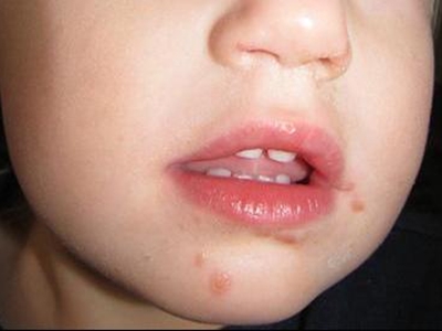 手足口病严重时造成整个嘴唇内侧布满密密麻麻的小水疱,疱液混浊,疱壁较薄亮,独立存在,多为圆形或类圆形。水疱周围绕有红晕,整个嘴唇内侧红肿。部分水疱由于前牙的摩擦而发生破溃,形成小的溃疡。由于疼痛明显,患儿可有流口水、拒食、哭闹的情况。