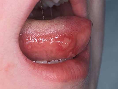 手足口病累及口腔者,在舌头上出现水疱,水疱会逐渐增大、破裂,进而形成不规则形白色溃疡,其周围有红晕,伴有一定程度的红肿。