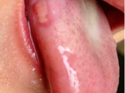 手足口病是肠道病毒引起的急性发热出疹性传染病,表现为舌侧面出现水疱,破裂后形成溃疡,溃疡面微微凹陷,颜色为白色,形状不规则。