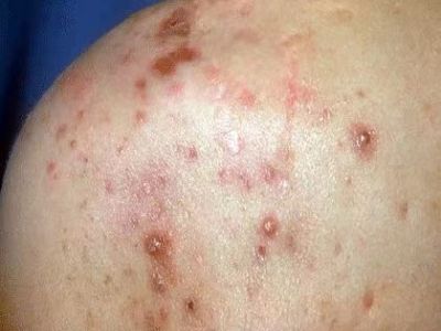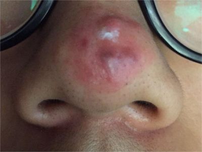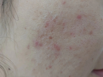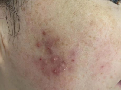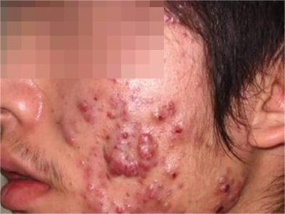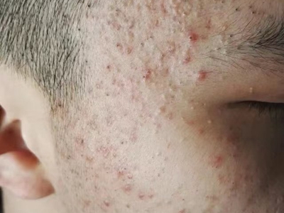 寻常痤疮严重者,额头上会出现大片的暗红色结节或囊肿,看起来像一片大红疙瘩,界限相对清晰,按压患处有波动感,大红疙瘩上方还有点状脓栓和结痂。