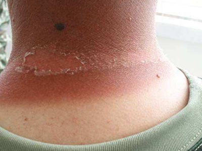 日晒伤可以发于全身暴露部位,如颈部,初起皮肤肿胀、泛红,严重时出现大片脱屑,形状不规则,脱皮后露出粉红色新生皮肤,通常需要2-3次脱皮方可完全愈合,患者不可随意撕剥,以免加重不适。