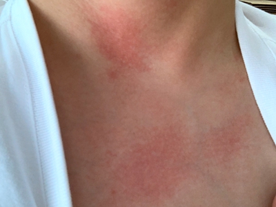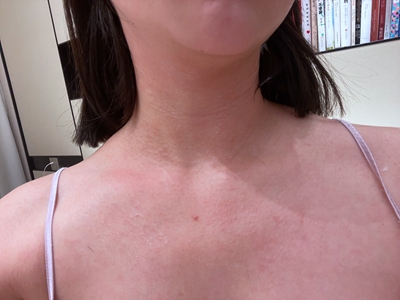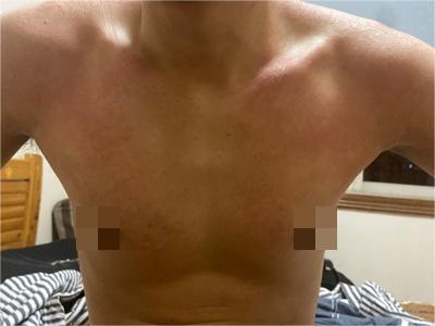日晒伤患者胸前两侧出现大面积红斑,边缘与周围正常皮肤之间界限不清,病情严重时出现明显刺痛,建议及时采取有效应对措施进行缓解。