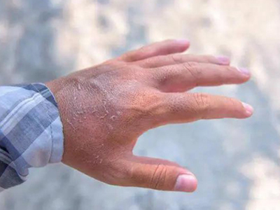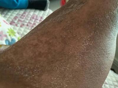 日晒伤进展到后期,表现为皮肤发黑的现象,其上可有灰白色皮肤大片脱落,露出红白色的新生皮肤,好发于夏季长期在户外工作的人群。