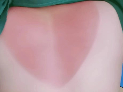 日晒伤患者后背整体轻微发红,边界不清,表面无破损、糜烂等其他异常,用手触摸时感觉质地光滑。此症状较轻,患者只需做好后期防晒与修复即可,无需进行其他特殊处理。