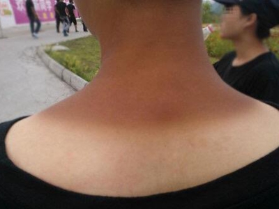 日晒伤容易发生在皮肤暴露部位,患者脖子晒伤后可出现弥漫性红色斑块,呈与衣领一致的圆弧形,与未被晒伤部位的界限清晰,局部皮温高,皮肤紧致。