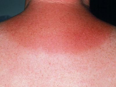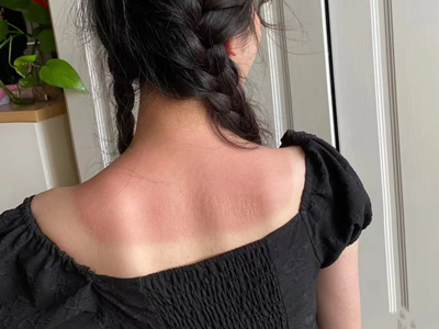 日晒伤多见于夏季不注意防晒者,在肩膀皮肤曝光处出现弥漫性红斑,境界清楚,自觉灼痛感,部分患者可伴有发热、头痛、乏力等全身症状。