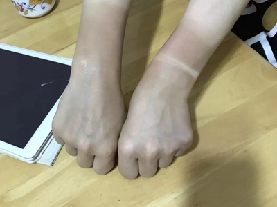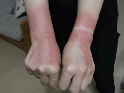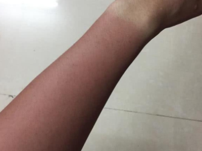 日晒伤患者手腕周围出现淡红色的斑,具体形态不规则,边缘并不清晰。此类情况下无需特殊治疗,只需后期做好防晒即可,患者无需过于担心。