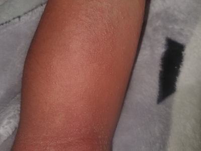 日晒伤患者胳膊整体发红,形成边缘模糊的红斑,表面有散在分布的密集性小疙瘩,为针尖、粟状大小,触摸时会感到明显凹凸不平。