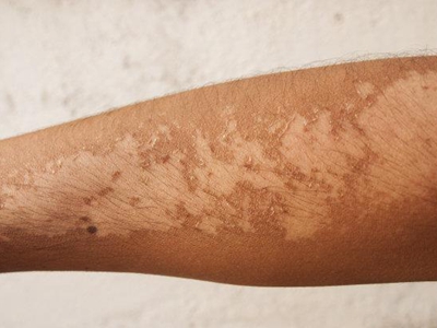 日晒伤恢复期皮损呈浅褐色发黑的斑片,其上可有针尖至粟粒状大小的白色脱屑现象,多由过度的日光照射所致,多见于夏季海边游玩的人群。