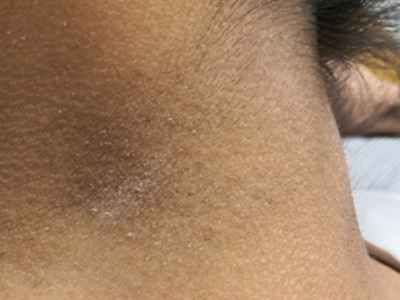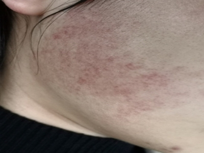 面颈部毛囊性红斑黑变病皮损好发于面部,皮肤可见淡棕色的色素沉着,在此基础上散发着密集红色毛囊性丘疹,逐渐融合成红色斑片状。