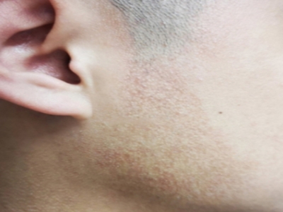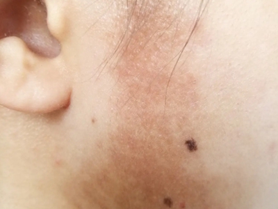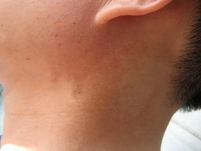 面颈部毛囊性红斑黑变病皮损好发于面颈部,首先从耳前部开始发病,以后累及耳下部、耳后区、侧颈部,缓慢地向外扩延,皮损为在色素斑基础上散发着密集淡褐色毛囊性丘疹,互相融合形成大斑片状,皮损境界清晰,因毳毛区细毛脱落后毛囊性红斑及黑变损害显得更明显,胡须与毛发不会脱落,一般不痒,压之表面红斑可消退,皮肤呈红棕色色素沉着,局部可伴有毛细血管扩张,色素沉着持久不退。