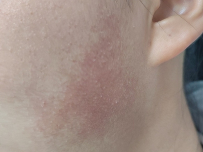 面颈部毛囊性红斑黑变病皮损表现为红色斑块,伴有瘙痒感,其表面可观察到细小的丘疹,用手摸上去脸颊皮肤有粗糙感。