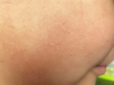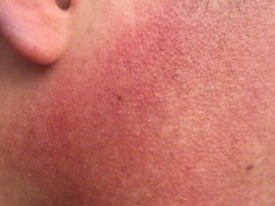 面颈部毛囊性红斑黑变病典型症状表现为脸上皮肤轻微发红,上面有数个散在分布的浅色毛囊性丘疹,呈针尖至粟粒状分布,触摸有颗粒感,局部没有萎缩或瘢痕。